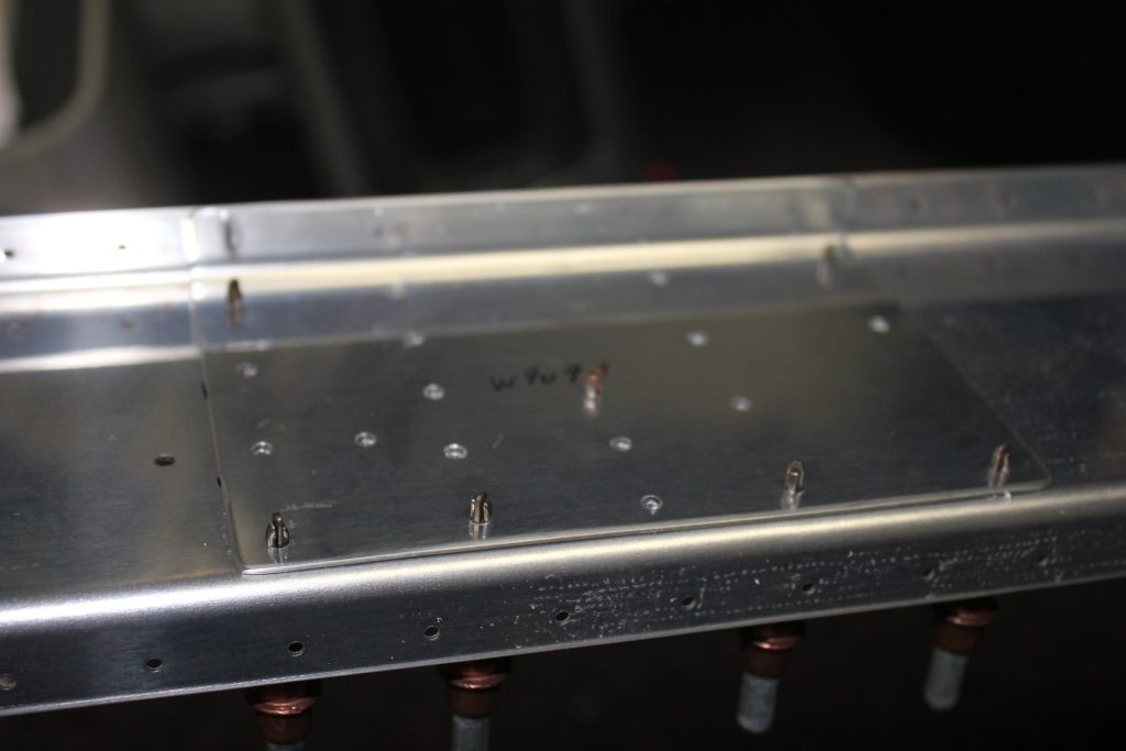 -CLAMPED 707 E/F REINFORCE PLATES TO SPAR, DRILLED/CLECOED & STARTED CUTTING AILERON PUSHROD HOLE