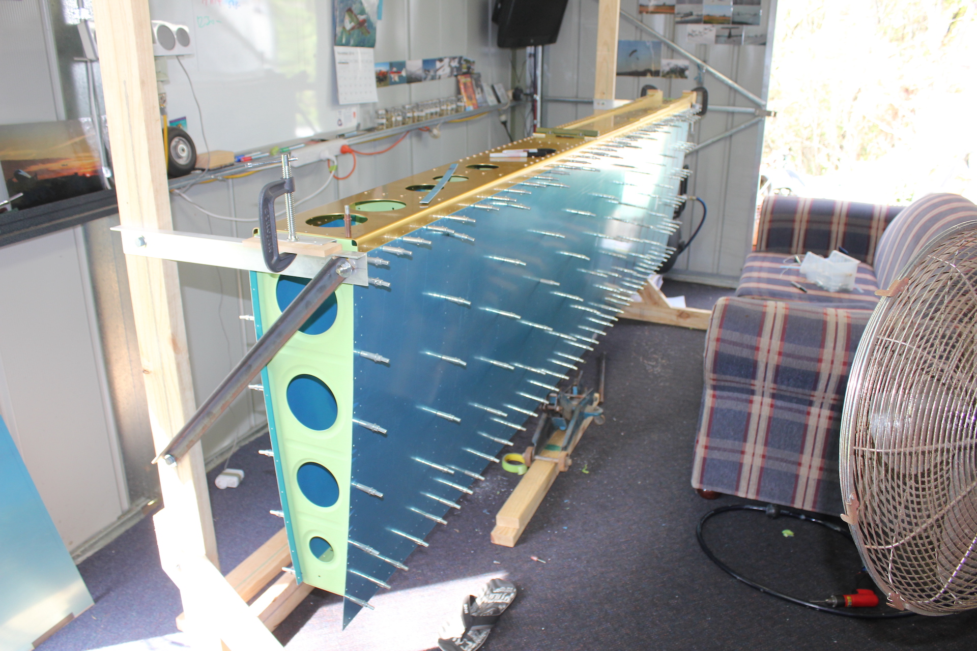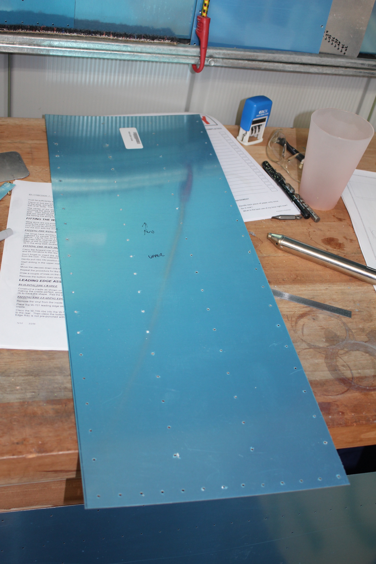 -FITTED UPPER SKINS TO SKELETON (NOTE: I DECIDED NOT TO DO SINGLE PIECE UPPER WING SKINS WHEN I RANG OUR LOCAL ALUMINIUM SUPPLIER AND WAS QUOTED $380 PER SHEET)