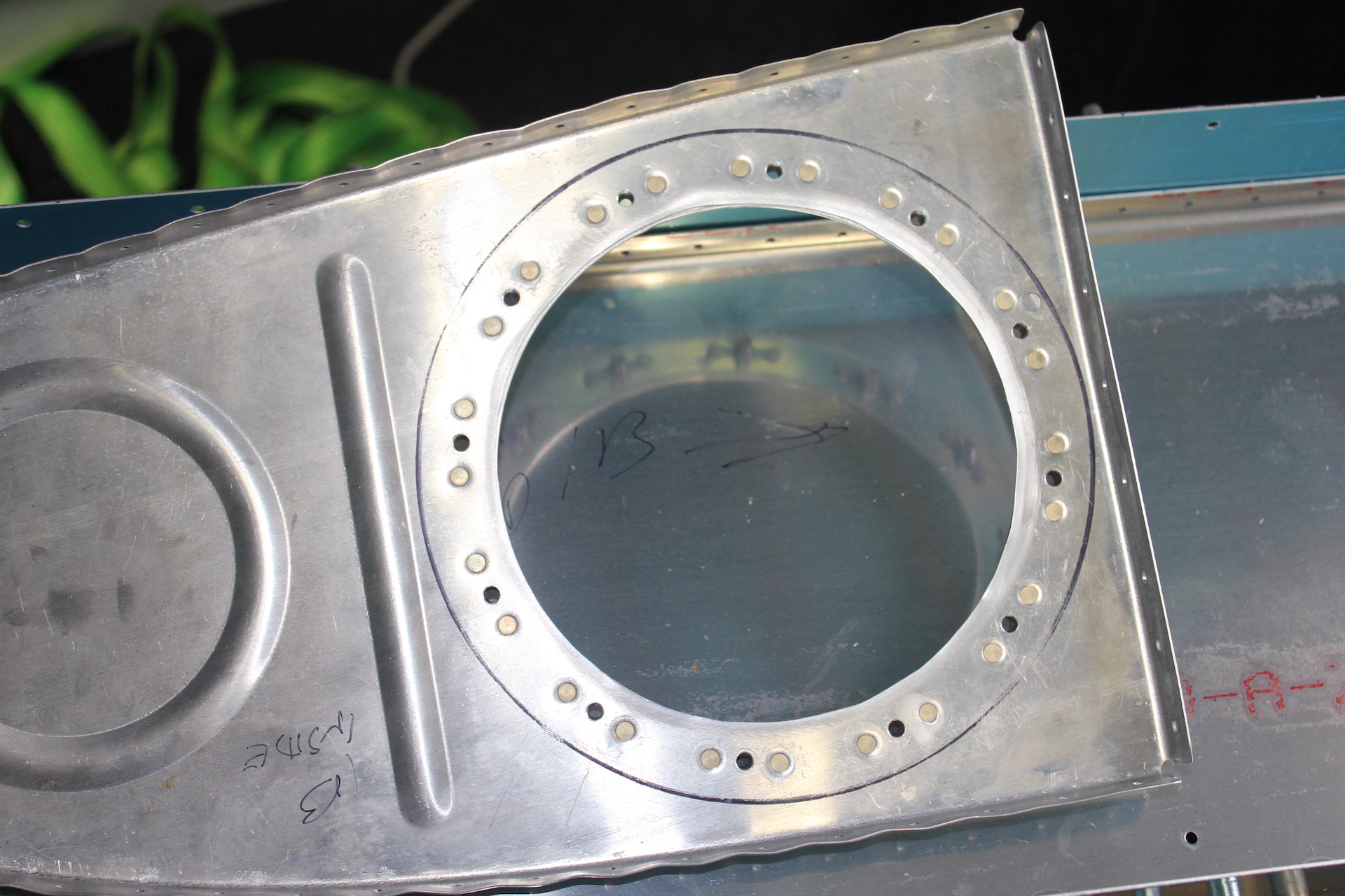 -I DRILLED THE UNCUT T411 ACCESS PANEL TO THE RIB, THEN CLECOED THE REINFORCEMENT RING & DRILLED NUTPLATE HOLES IN THE RIB