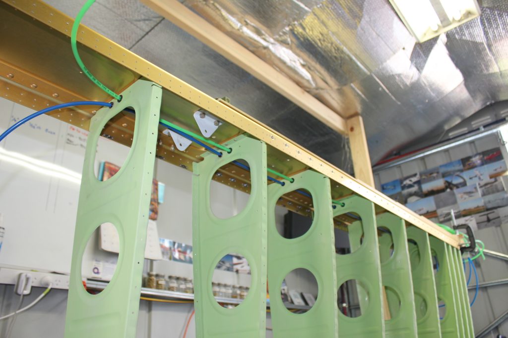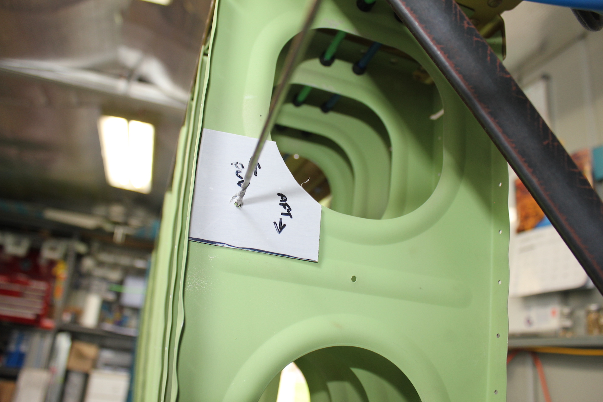 DECIDED TO RUN WIRES IN A 1/4″ BUSHING DRILLED IN THE LOWER 1/3 OF THE RIB BETWEEN THE LARGE LIGHTENING HOLE AND THE NEXT ONE AFT.