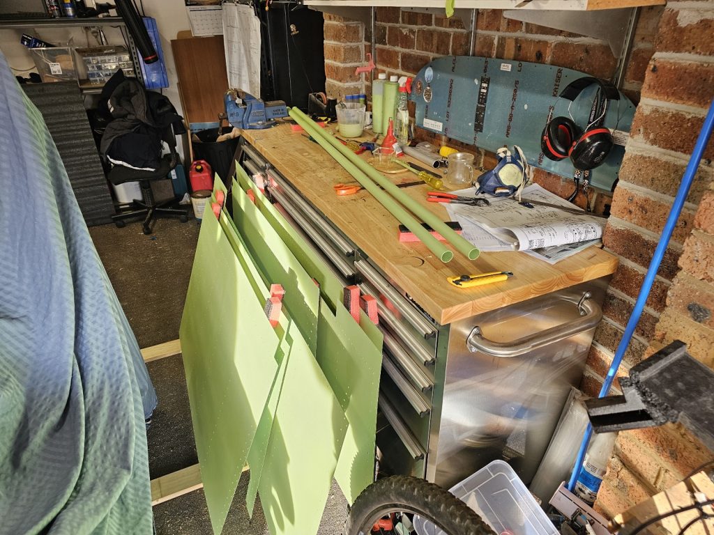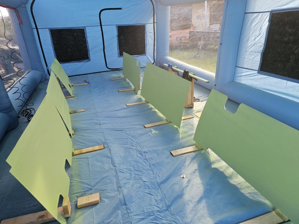 -Prepped (Alumiprep33) & Primed all right side wing skins, the lower left wing skins & the pushrods, new inflatable paint booth worked a treat