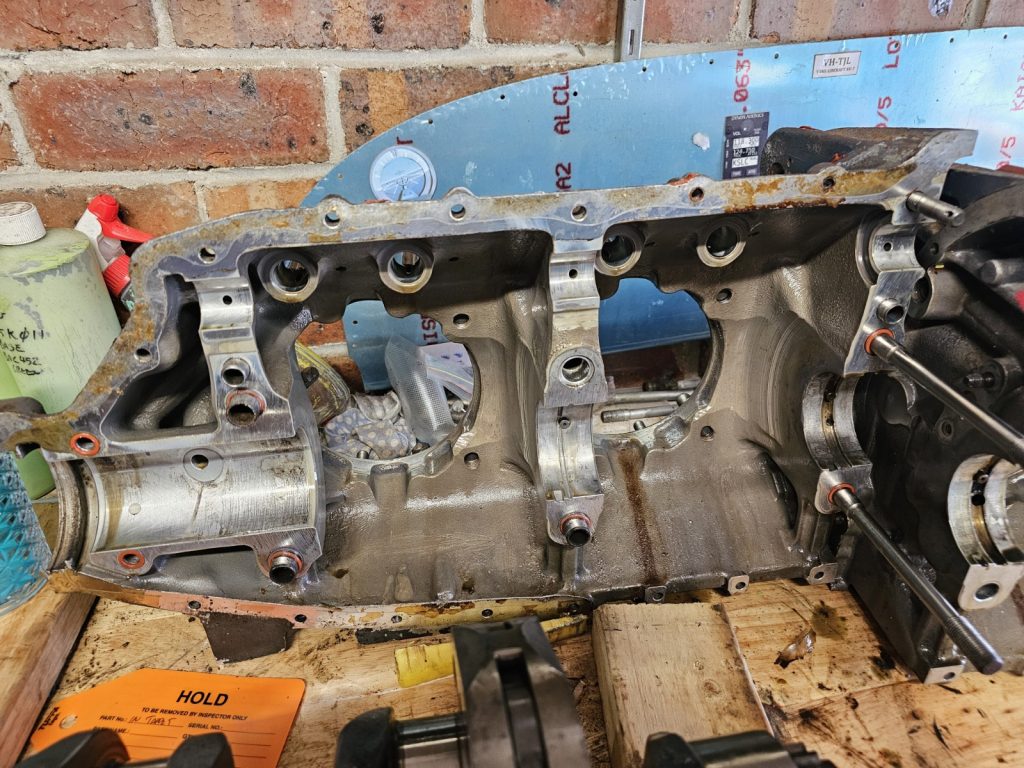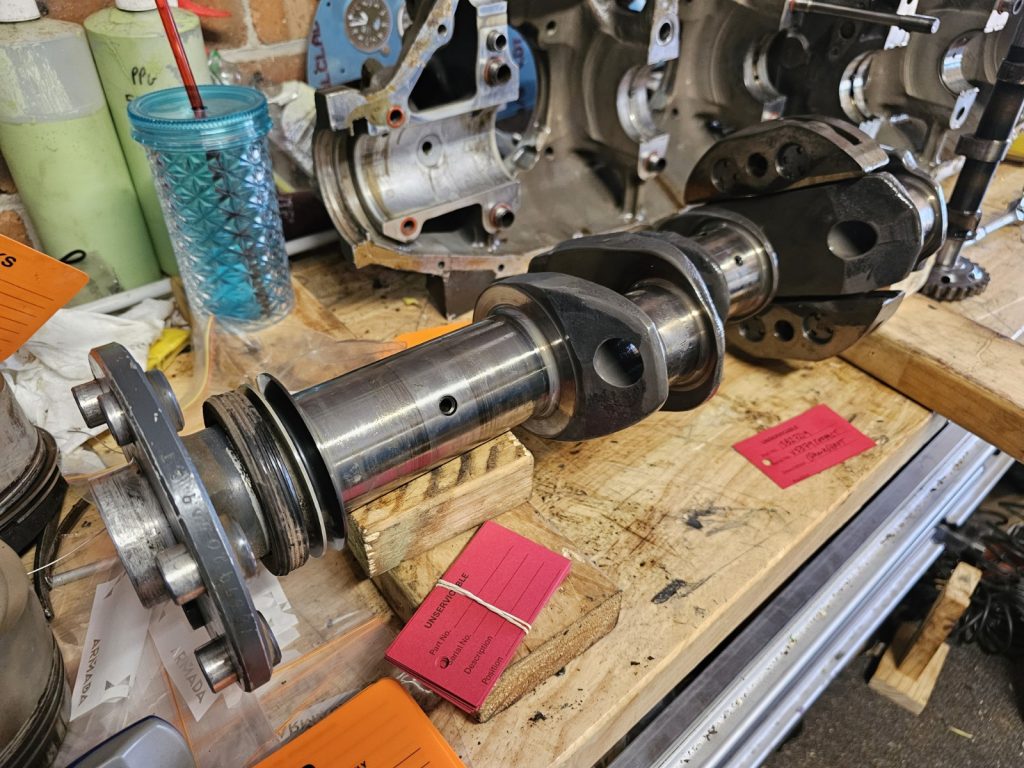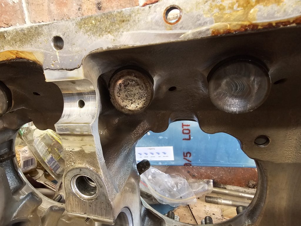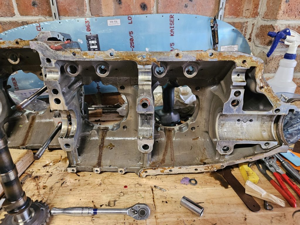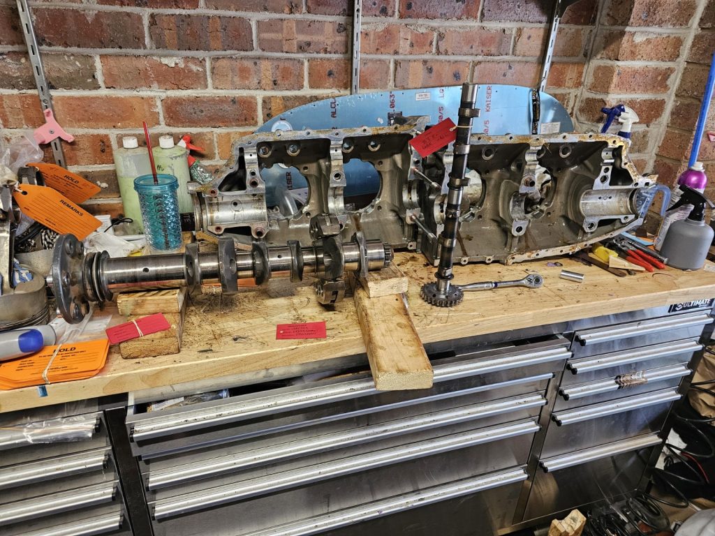 -Split the case, the crank looks good but immediately noticed a severely spalled tappet (#3 exhaust) and matching worn cam lobe